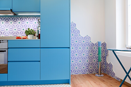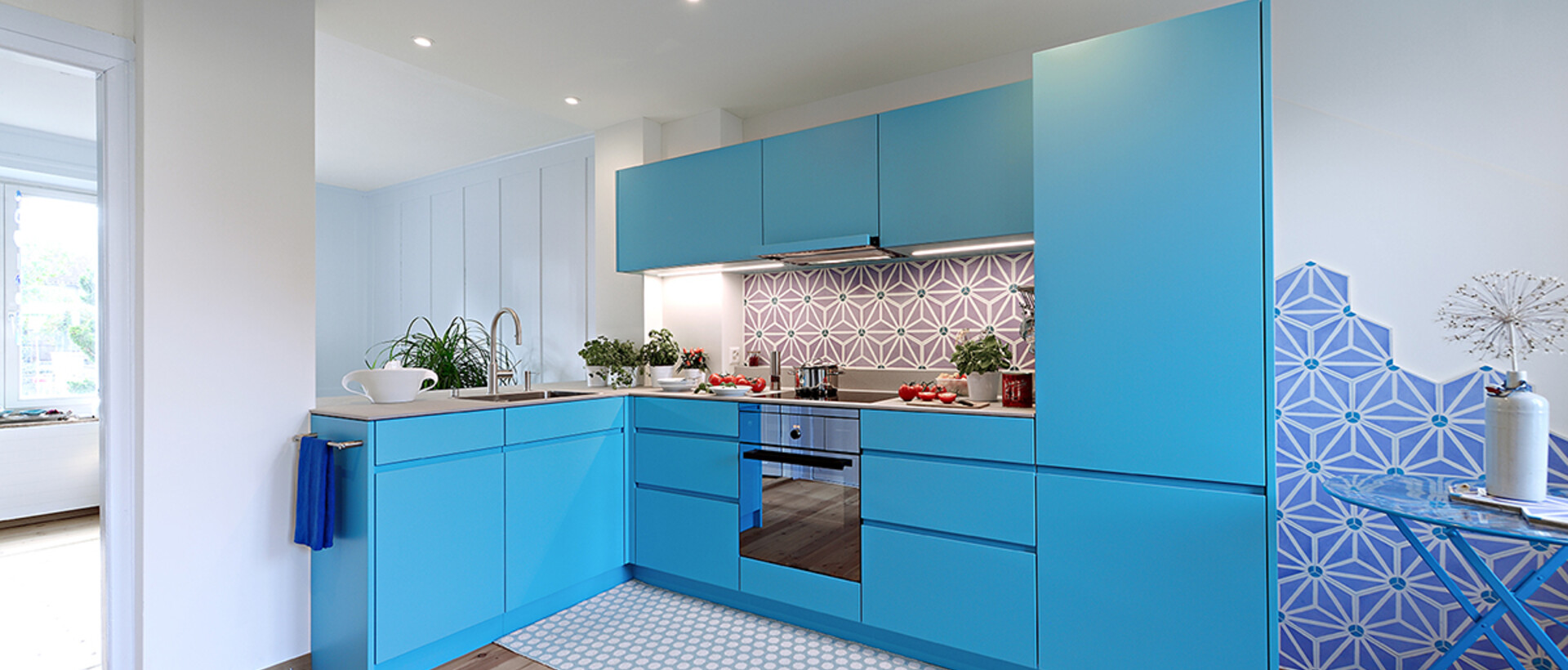 Die Farbe Blau wirkt beruhigend und entspannend, verkörpert Harmonie und Zufriedenheit – ideale Voraussetzungen also für die Verwendung im Küchendesign. Die türkisblau lackierten Fronten schaffen eine stimmungsvolle Atmosphäre, während die grosszügige Arbeitsfläche aus robustem Quarz-Kunststein viel Platz bietet.