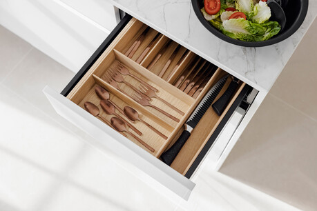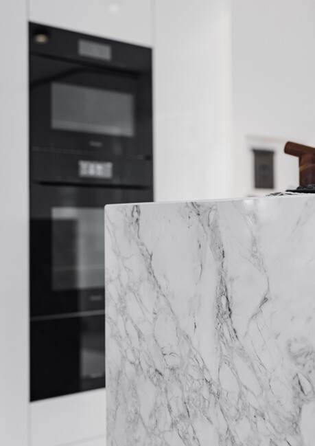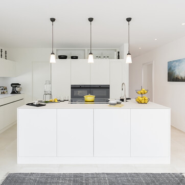 Die Kochinsel wird zum Star dieser Küche: Die Keramik-Abdeckung sowie die Front im Marmor-Look sind robust und hitzebeständig und eigenen sich bestens für jegliche Alltagsaufgabe. Raffinierte Akzente wie die Schräge mit Platz für die Barhocker an der Insel verleihen dieser Küche einen Hauch Glamour. Hell lackierte Hochglanz-Fronten, kombiniert mit einer dunklen Glas-Rückwand, erzeugen einen eleganten Kontrast im Hintergrund.