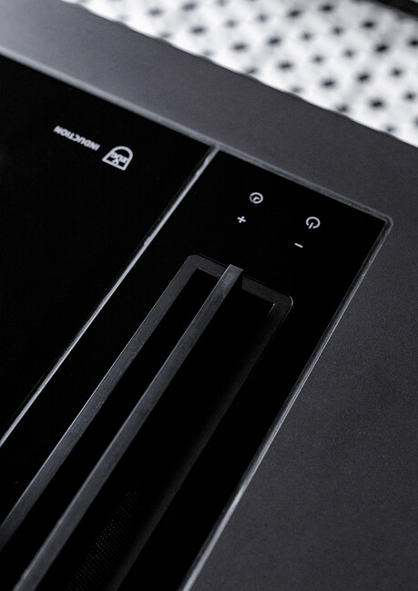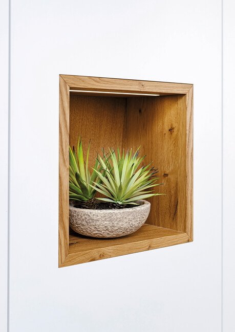 Der spielerische Umgang mit Formen und Stilelementen verleiht der Küche seinen ganz eigenen Charakter und eine ausgesprochene Lebendigkeit. Das prägnante Muster der Bodenplatten setzt einen attraktiven Kontrast zur reduzierten Farbgebung der Küche. Die kunstvoll gesetzten Details verleihen dem Design das gewisse Etwas. Trotz Dachschräge bietet die Küche viel Raum für Kreativität und gemeinsames Kochen.