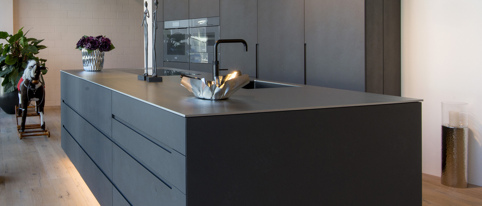 Bisweilen gewinnt ein Küchendesign durch konsequentes Weglassen. Diese Küche kommt ganz ohne Schnörkel und unnötige Spielereien aus – und schafft dadurch ein überzeugendes Gesamtbild. Die clevere Sockelbeleuchtung verleiht der imposanten Kücheninsel eine ungeahnte Leichtigkeit, während die Arbeitsplatte aus Chromstahl den reduzierten Stil auf funktionale Weise fortführt.