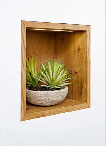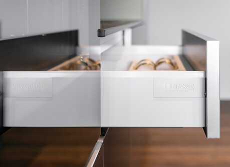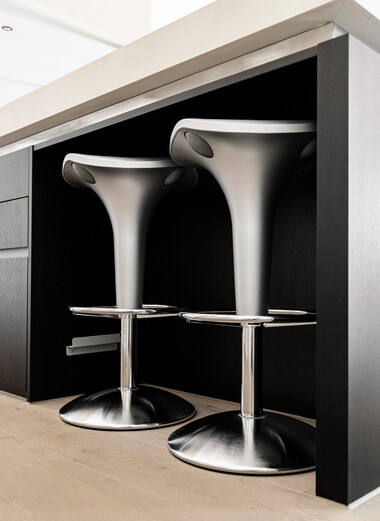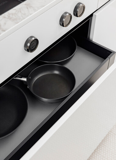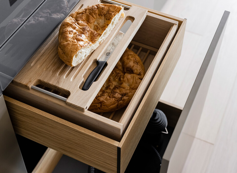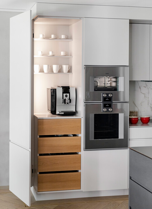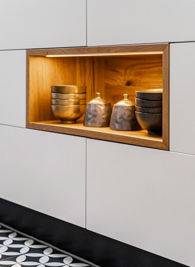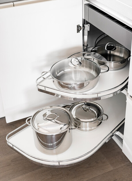 Auch vermeintliche Kleinigkeiten sind nicht zu unterschätzen. Mit einem Soft-Close-Mechanismus gehören knallende Türen und Schubladen der Vergangenheit an. Ein drehbarer Eckschrank holt das Maximum aus den Platzverhältnissen heraus. Eine flexible Schubladeneinteilung sorgt für Übersicht. Praktische Ausziehschränke schaffen zusätzlichen Stauraum. Energiesparende LED-Beleuchtung in den Schränken bringt Licht in die hintersten Ecken. Und Stromanschlüsse an den Unterseiten der Oberschränke sind funktional und geben dem Design noch mehr Raum.