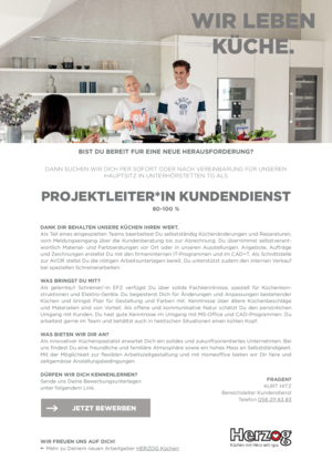 Als innovativer Küchenspezialist erwartet Dich ein solides und zukunftsorientiertes Unternehmen. Bei uns findest Du eine freundliche und familiäre Atmosphäre sowie ein hohes Mass an Selbstständigkeit.